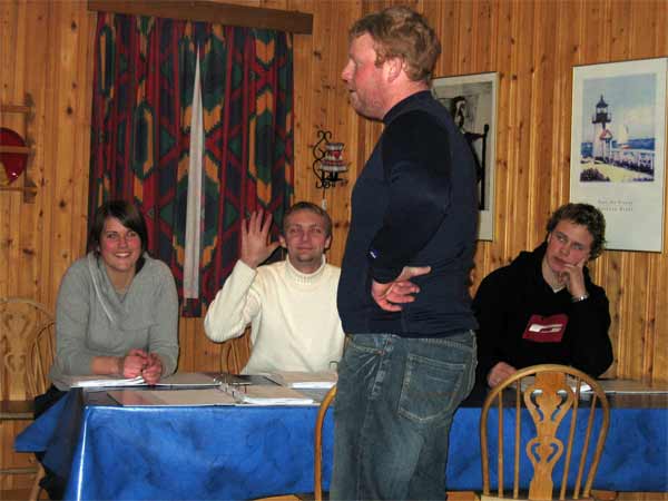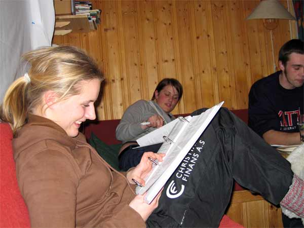 | Første kveld. Heidi og Mari sjekker innholdet i kurspermen, Yngvi er bare trøtt. |