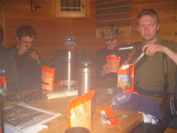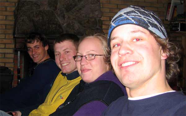 | Vel framme på Sloaros ca kl 24. Fredrik, Mari, Kristoffer og Sveinung. Middagen er Real turmat. |