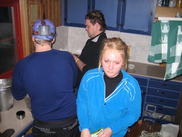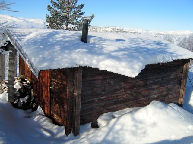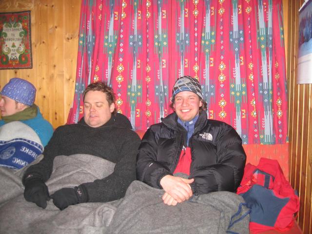 | Så ble det mørkt...og litt verre. Jeg labbet opp til hytta som lå 50 meter bortenfor, mens laget bestemte seg for å prøve å sove inni en pinne. |