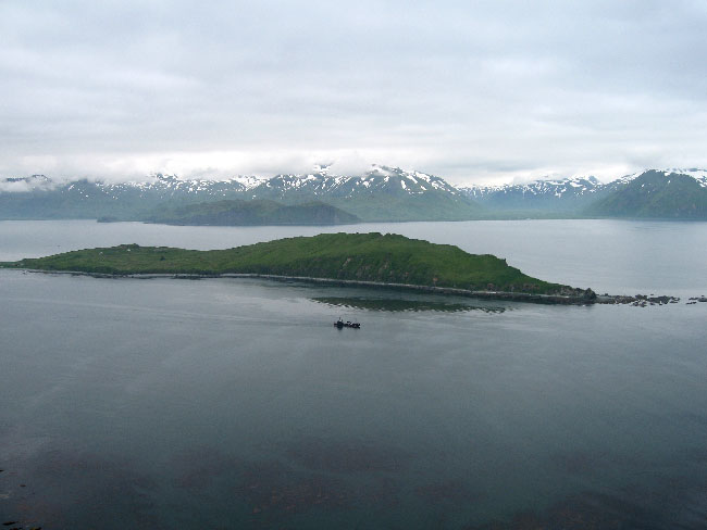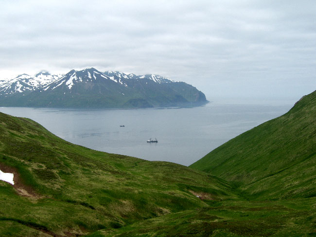 | Så var det på tide å reise til Dutch Harbor, eller Unalaska som det egentlig heter. Her fløy vi over en vulkan på vei ut over Aleutian-øykjeden. |