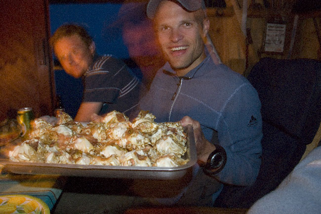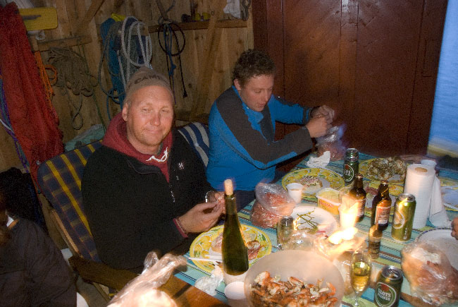 | Så var det mat igjen. Egentlig skulle det være reker, men når man koker 80 krabber så... Fant ut det var best å justere ned antall kilo reker ja. |