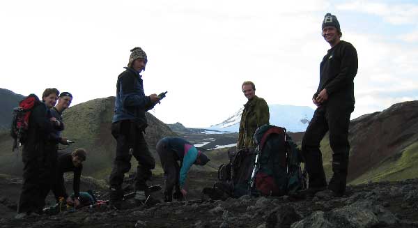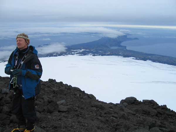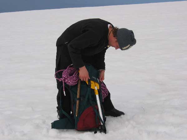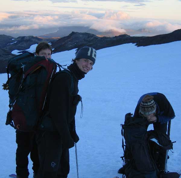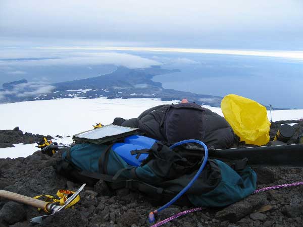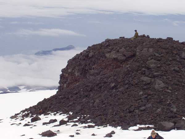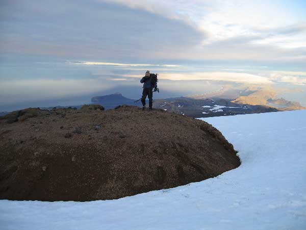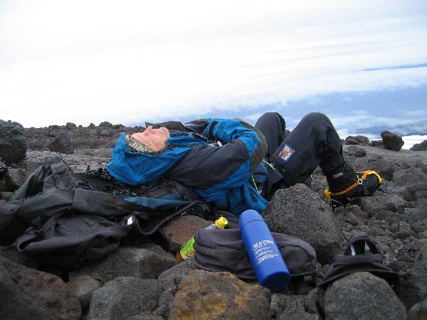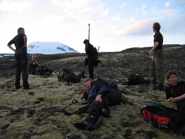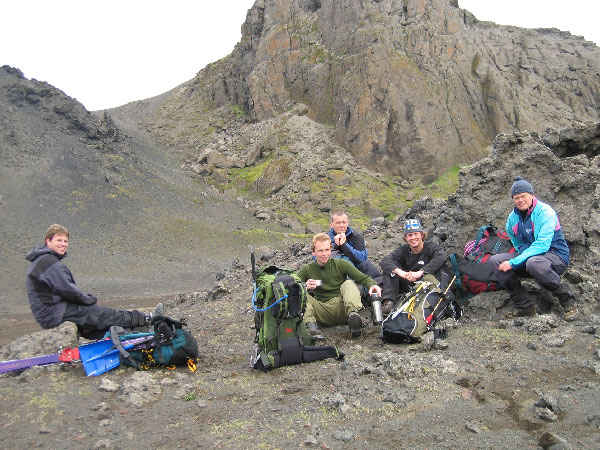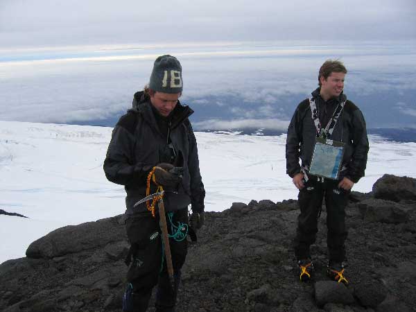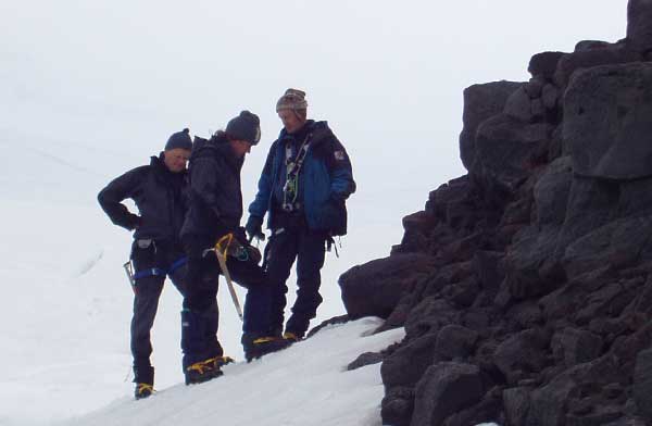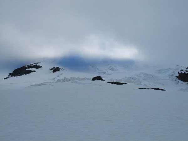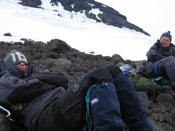 Oppe ved Nunataken. Det var såpass tett videre opp de siste 6-700 høydemeterene at vi avventet her for å se om det letnet. Temperaturen lå faktisk på rundt 10 grader. |