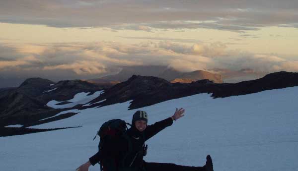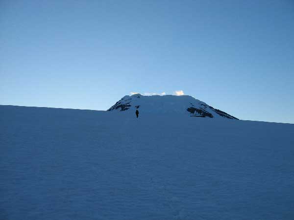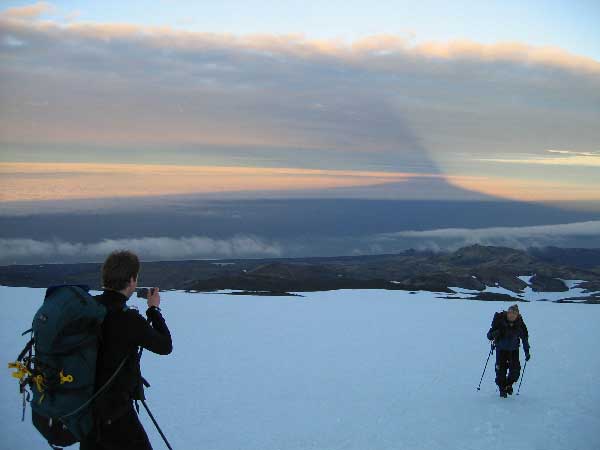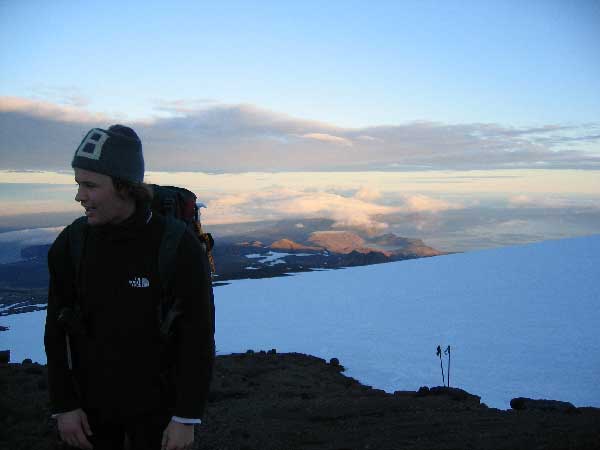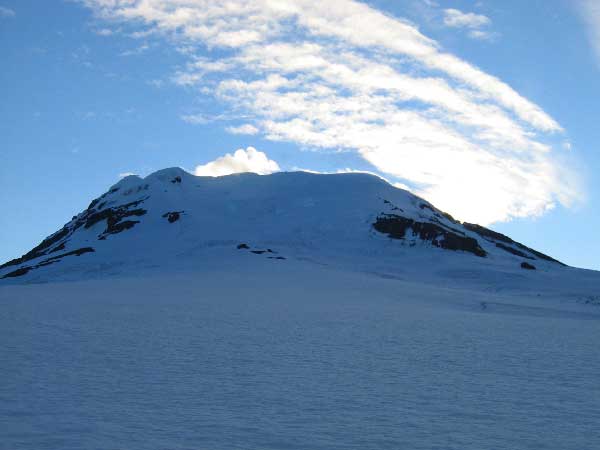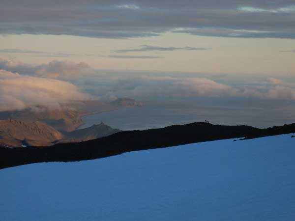Det begynner å bli morgen, og sola kommer snart fram på siden av Beerenberg. Det kommer samtidig noen skyer frem... |