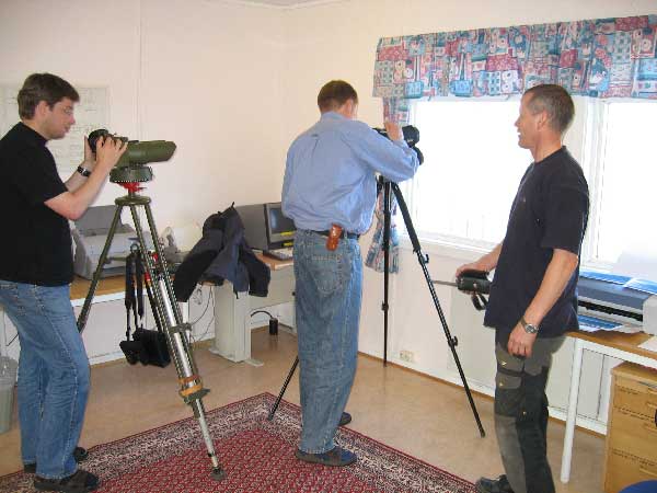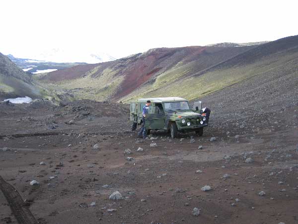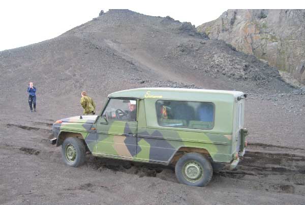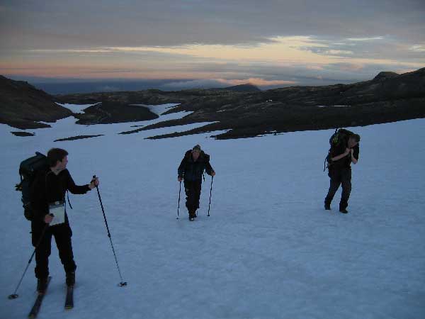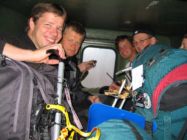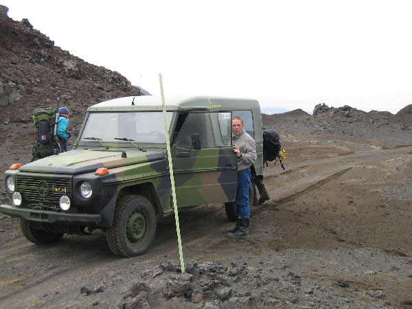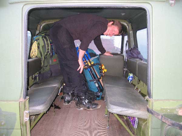 Vi (iallefall oss som var oppe til normal tid) sov et par timer på kvelden, før vi dro fra Stasjonen ved midnatt. I følge statuttene for "Beerenbergbestiger"-merket kan man bli kjørt til 50 meter over havet. Fra Stasjonen tar bilturen ca en time (i 10-30 km/t). Her er det Gjermund som pakker bilen. |