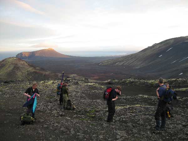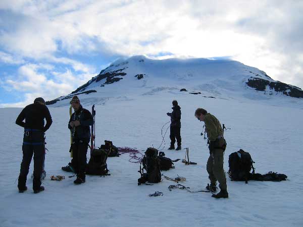 Siste gjennomgang av utstyret kl 0100. Fjellet ser fint og flatt ut i bakgrunnen. |