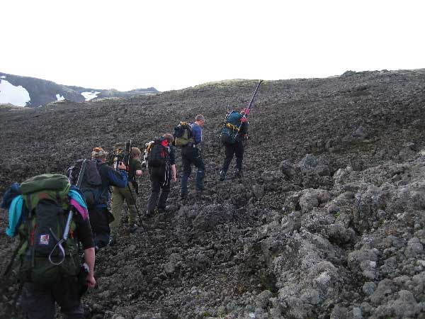 Første kilometerene er gåing på virkelig ujevn vulkansk stein. |